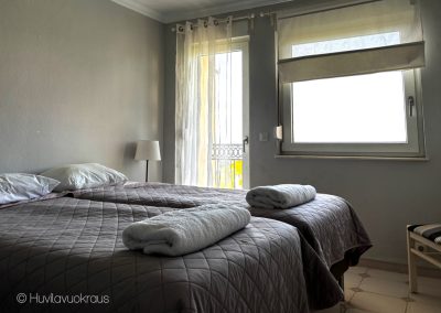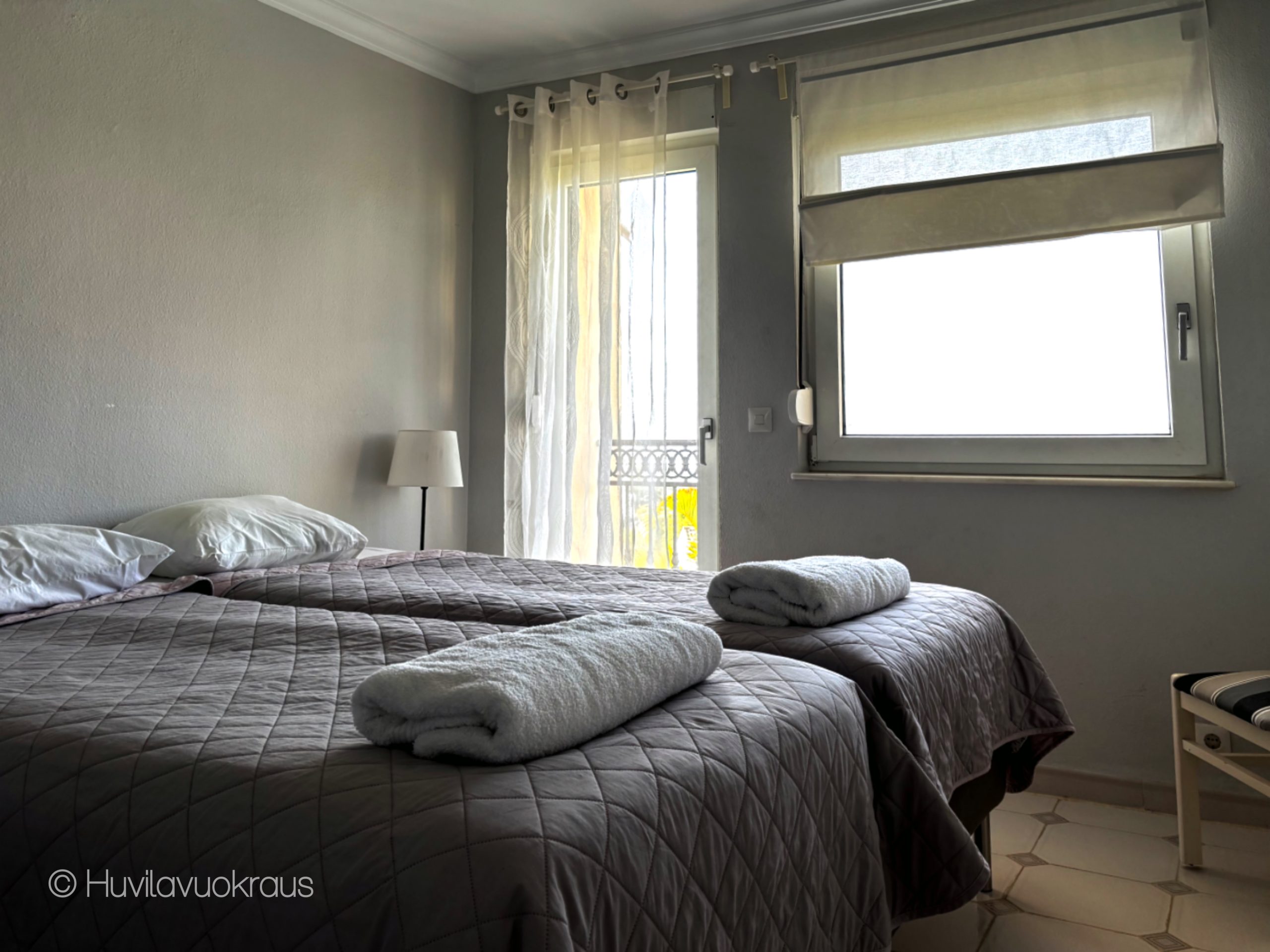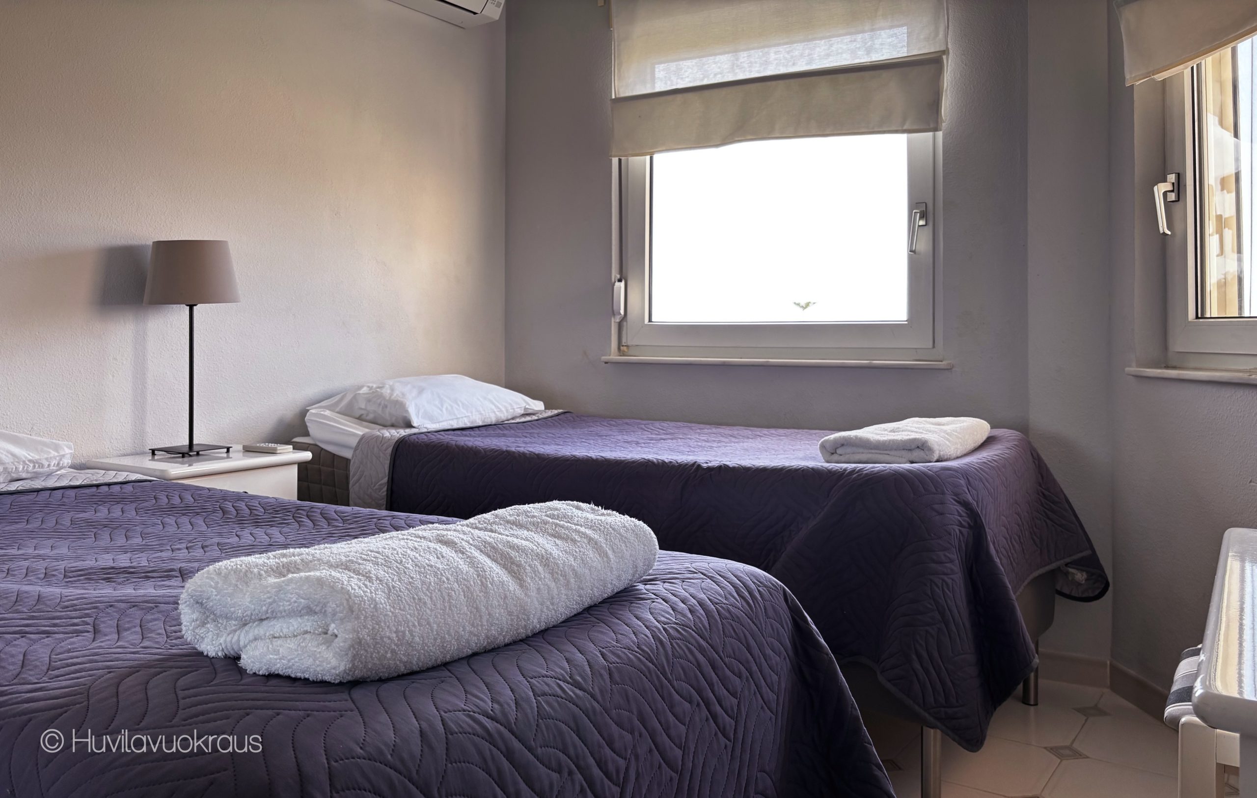 Yläkerran kahdessa makuuhuoneessa on vuoteet neljälle. Toisessa makuuhuoneessa on ranskalainen parveke ja kummastakin huikeat näkymät Välimerelle.