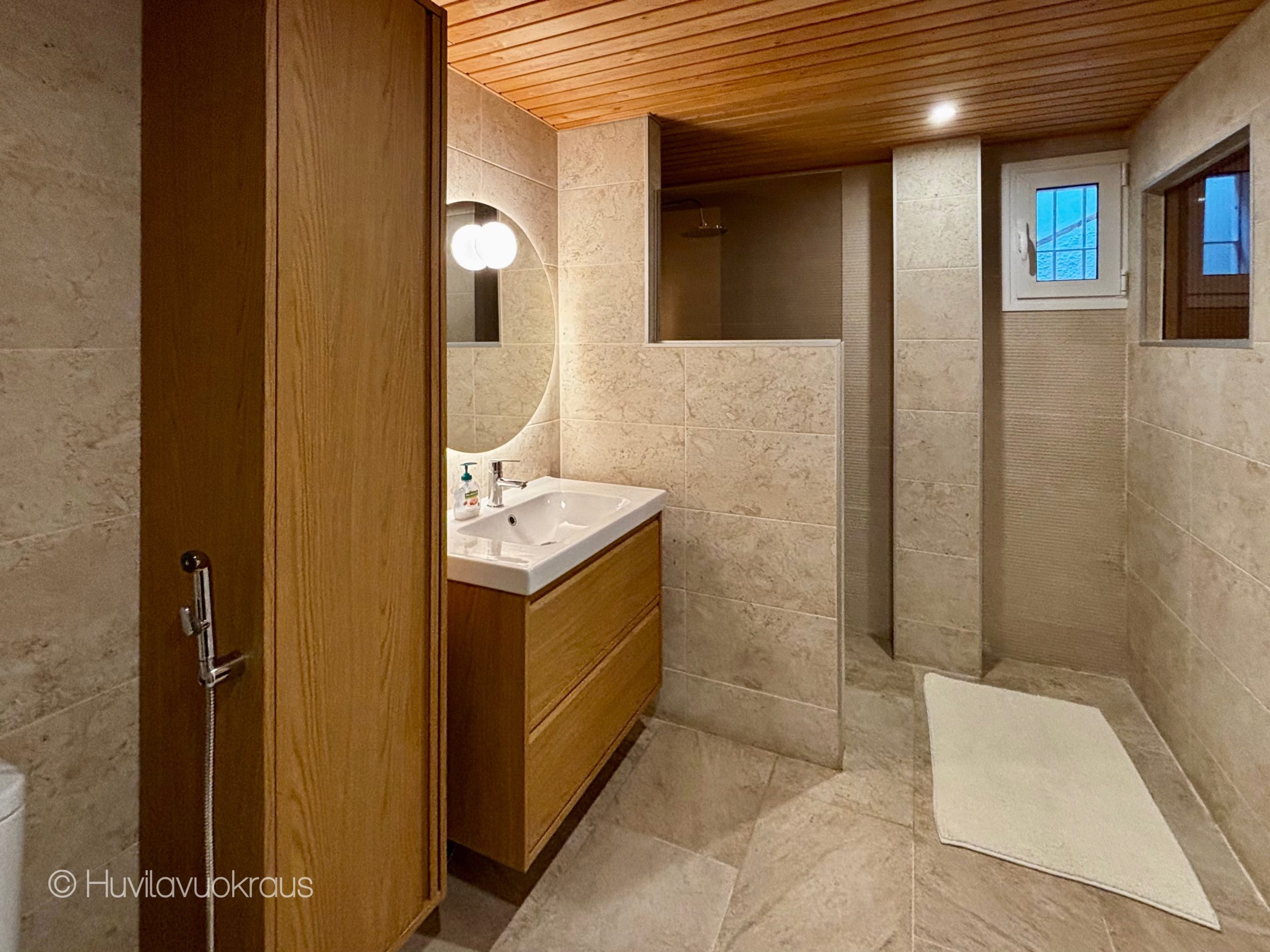 Upealla luonnonkiviterassilla voit ottaa aurinkoa palmun alla ja viileät juomat on helppo tarjoilla alakerran keittiöstä. Huvila sijaitsee rauhallisella omakotitalueella.